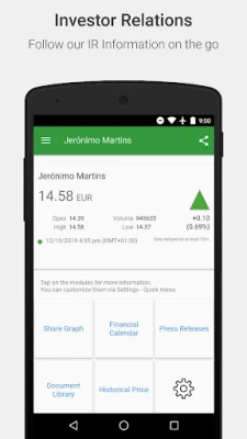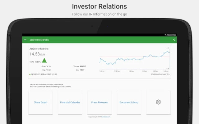 Aplikacja Jerónimo Martins Investor & Media Relations zapewnia bieżący dostęp do danych o kursach akcji, komunikatów giełdowych i rynkowych oraz wydarzeń z kalendarza relacji inwestorskich. Bądź zawsze na bieżąco z kluczowymi informacjami finansowymi i korporacyjnymi, w jednym miejscu. Idealna dla inwestorów i mediów.