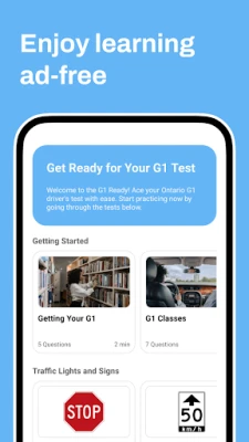 Niezależnie od tego, czy jesteś przyszłym kierowcą stawiającym pierwsze kroki, czy potrzebujesz gruntownej powtórki przed zbliżającym się egzaminem, "G1 Ready" to efektywny sposób na naukę. Pomagamy Ci przygotować się mądrzej i bez stresu podejść do testu G1 w Ontario. Pragniemy podkreślić, że aplikacja "G1 Ready" jest produktem niezależnym i nie jest w żaden sposób powiązana, wspierana ani sponsorowana przez Rząd Ontario czy Ministerstwo Transportu (MTO). Jej zawartość opiera się wyłącznie na Oficjalnym Podręczniku Kierowcy MTO, dostępnym publicznie.